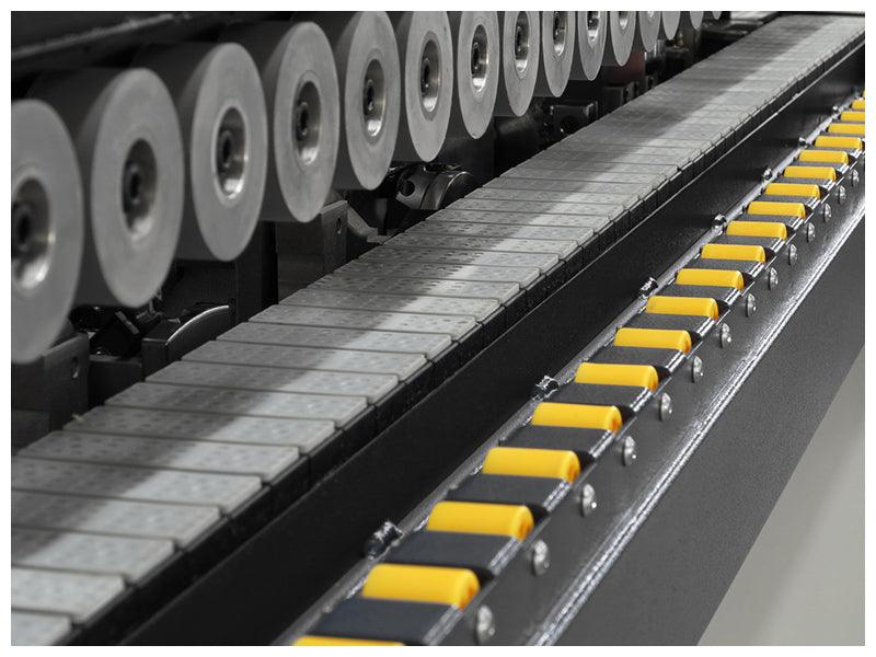 • The steady work-piece feeding mechanism is comprised of a chain and set of drive rollers, which will not scratch the work-piece surface.