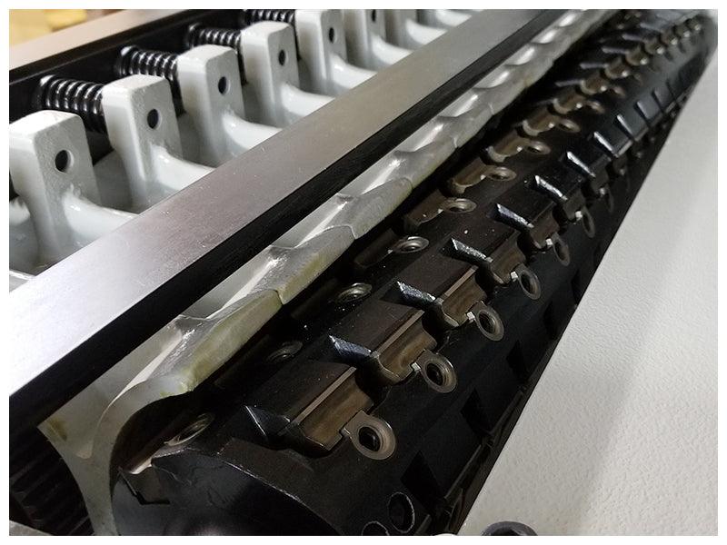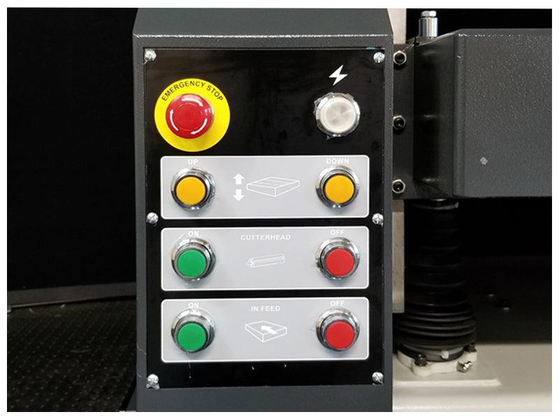 The Cantek P630HV 24″ Planer has a solid steel helical cutterhead with two-sided carbide knife inserts that require no adjustments when changing. With a digital readout and simple PC controller, setting the table height is quick, accurate, and easy. The frame is made from heavy cast iron with known vibration damping resulting in long bearing life and superior cut quality. The planer’s segmented, serrated infeed roll & segmented pressure shoe ensures material is held firmly during the feeding and planning process The P630HV planer has a quick-set micro-adjustable lever that easily raises and lowers the table rollers to aid in the feeding of difficult to feel wood. The industry standard 30×12×1.5mm carbide insert knives are positioned by two pins and held buy a gib and screw which do not require any special tools to set the height. The knives have a slight bevel in the corners which provide for a superior finish without any stepping between the knives. In addition, the knives sit vertically into the head which produces a proper cutting angle and gulley to allow for superior cutting depth.