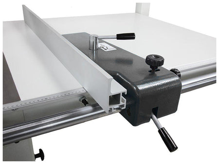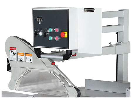 - Ergonomic eye level control panel for adjusting the blade height, and blade angle along with on/off switches for the main and scoring motors