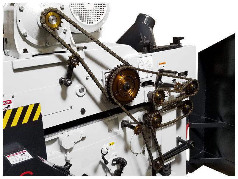 - Spring loaded conveyor pin system ensures material is passed over the bottom cutterhead to resulting in a flat and uniform board prior to planing to thickness on the top head