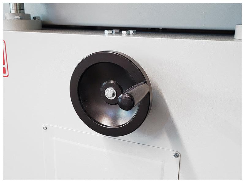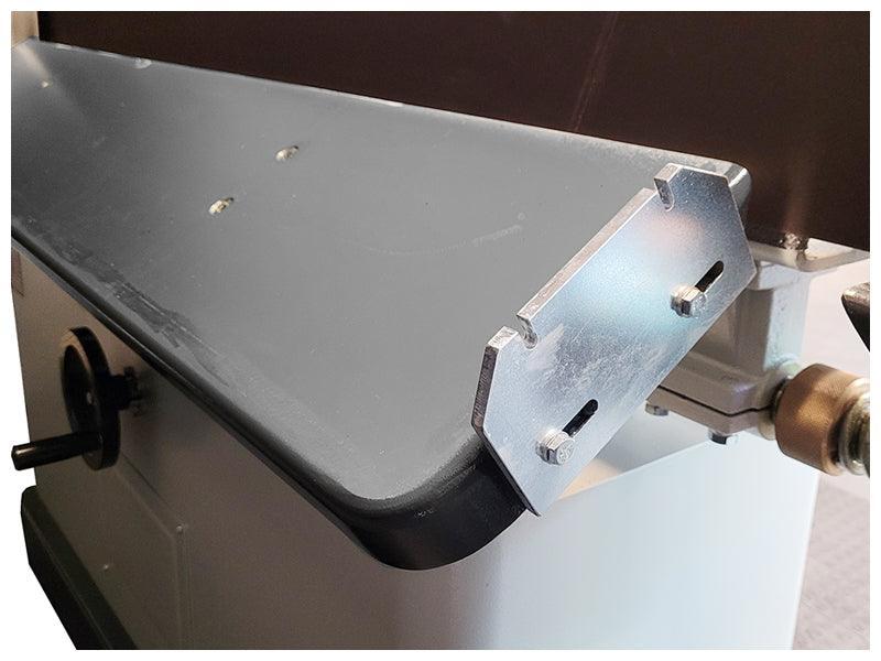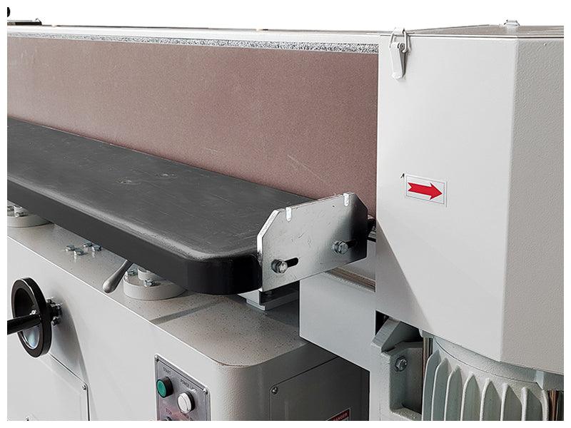 - Front, back and side tables are adjustable in height by handwheel and can be tilted for bevel sanding operations