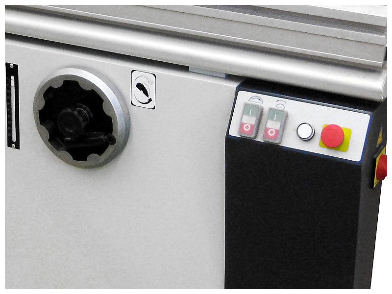 - Manual tilting of the saw blades with angle indicator conveniently located by adjustment handwheel