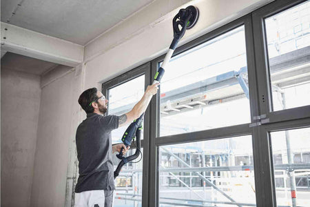 The new generation PLANEX Drywall Sander is revolutionizing drywall construction – with LED light and random orbit movement. The full circle LED light ring works like a built in raking light and reveals any unevenness during sanding. The random orbit sanding motion produces outstanding surface quality – without any expensive reworking. The adjustable suction power, variable working length and ergonomic T-handle ensure ergonomic work on walls and ceilings – making the tool easy to control, even during long periods of operation.