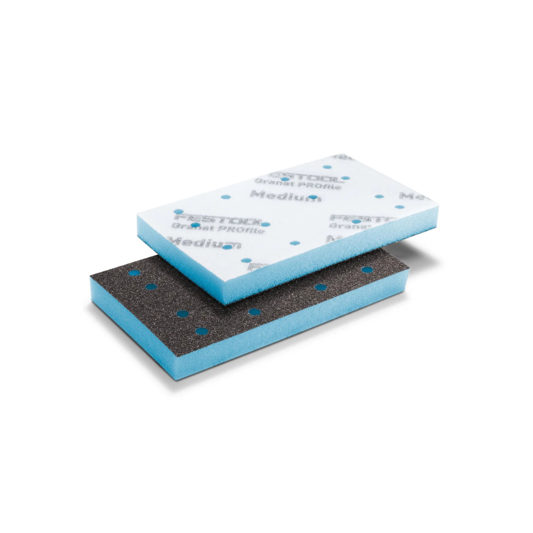 Granat PROfile is a new class of soft foam abrasive developed for precision surface preparation on complex shapes. Backed by a 1/2" (13 mm) flexible polyurethane foam layer and bonded with Festool’s high-performance Granat abrasive, this system delivers aggressive sanding power while adapting effortlessly to contours, curves, and profiles.