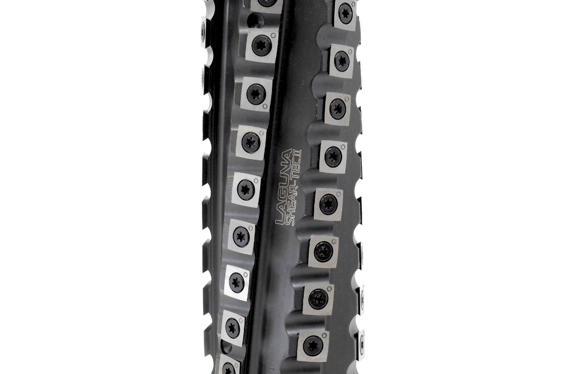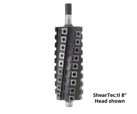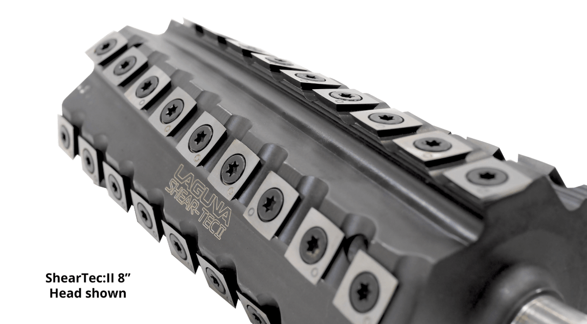 - ShearTec II Cutterhead - The ShearTec II cuttherhead comes as standard equipment on PX|20 Planer. The ShearTec II is a 6-row carbide insert cutterhead that produces a superior surface finish on all woods including challenging hardwoods. The ShearTec II knives and fasteners have a T-step design to maximize clamping force on the knives preventing knife cracking and chatter. The 4-sided carbide insert knives produce a shear cut for flawless results. The ShearTec II cutterhead has deep grooves that make the cutterhead very quiet and improve shaving ejection. The 4-sided knives can be rotated for a new cutting edge without the need for a knife setting jig