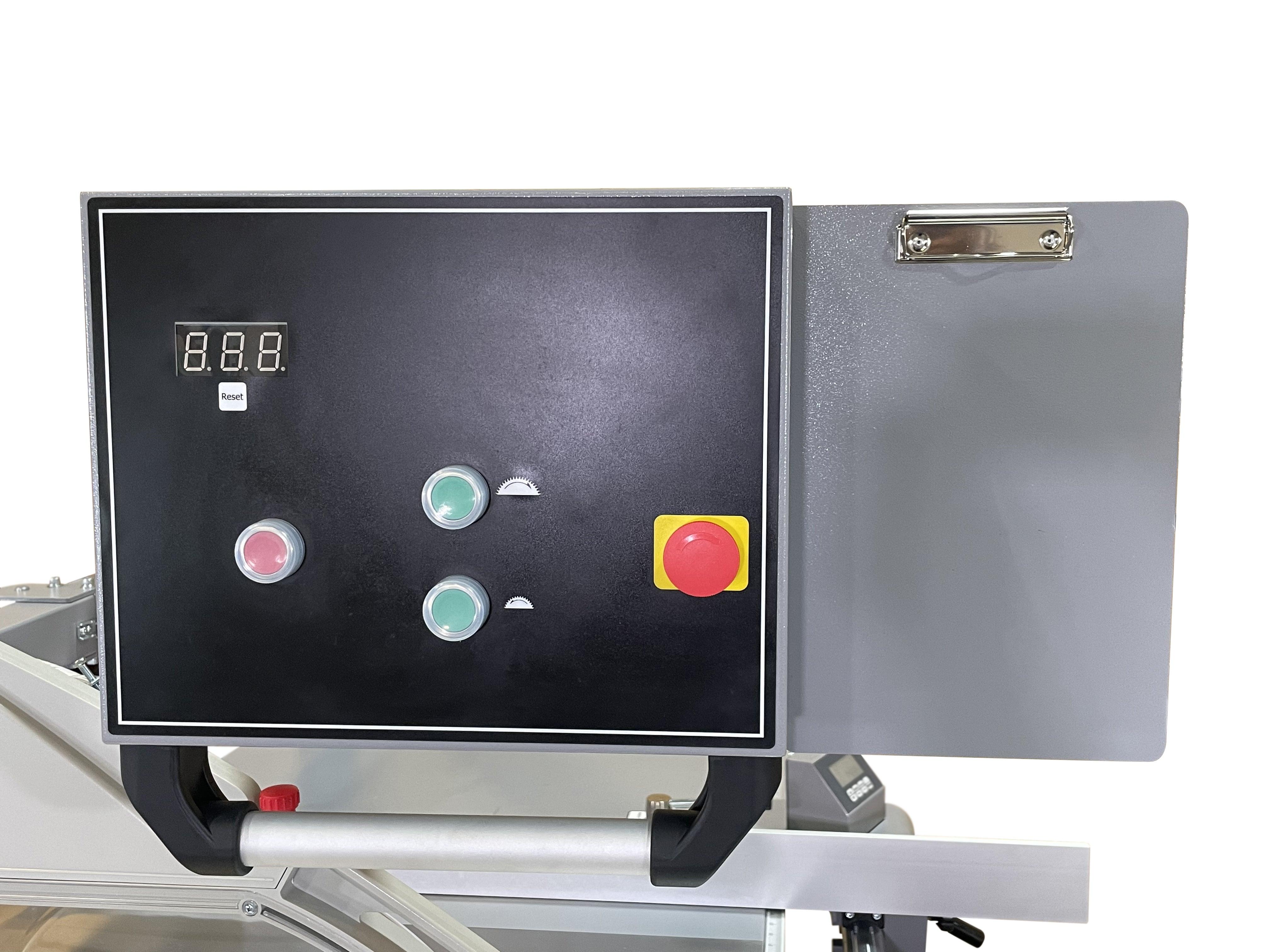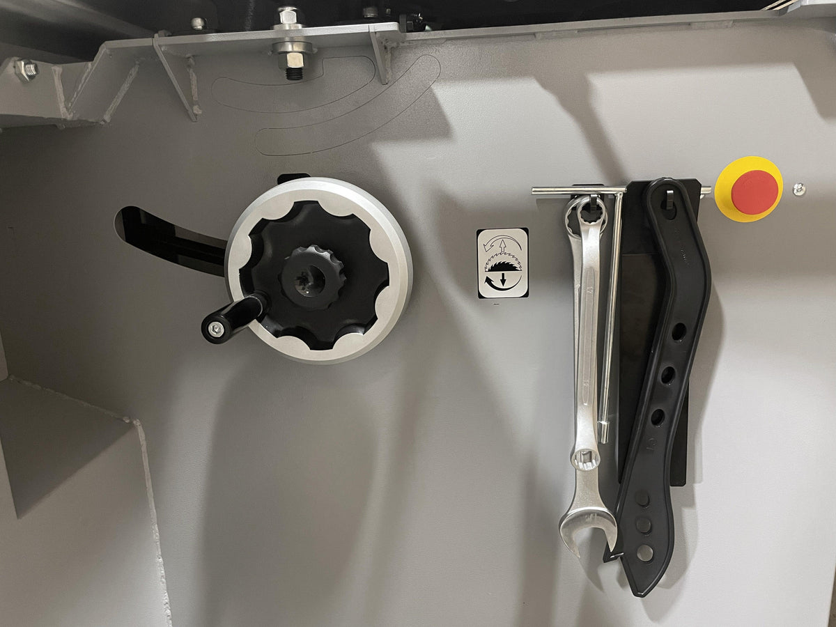 The machine comes standard with two overhead blade guards (90° and 45°) featuring a quick-change and swing-away function, allowing fast switching and easy repositioning when needed. Included accessories consist of a push handle, hold-down clamp, and wedge clamp.