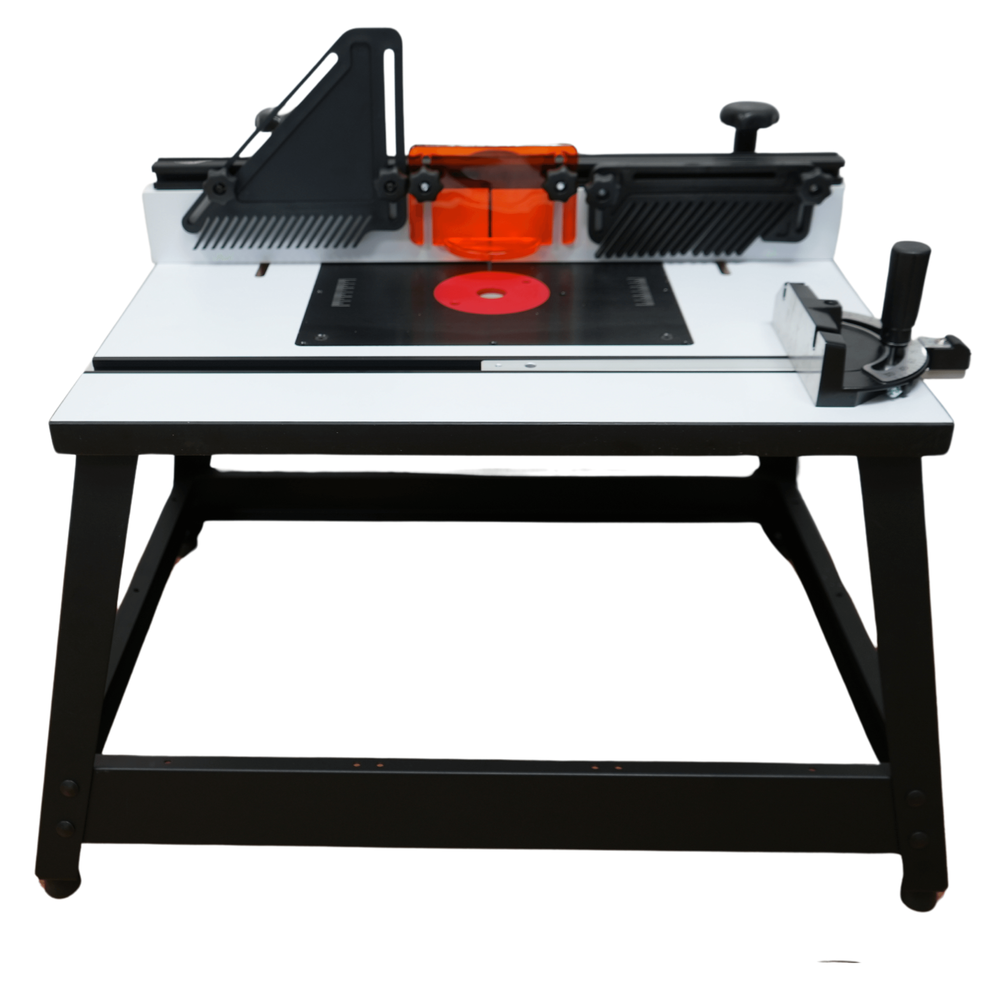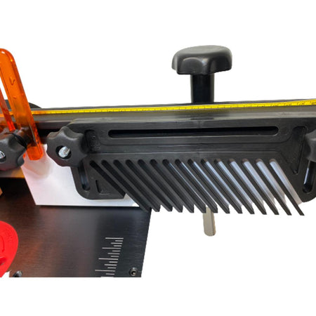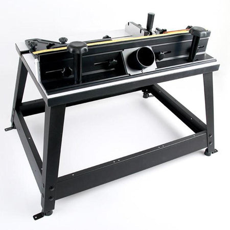 Quick-release router table fence Kit has two MDF fence plates supported by a solid aluminum "L" fence with built-in track.