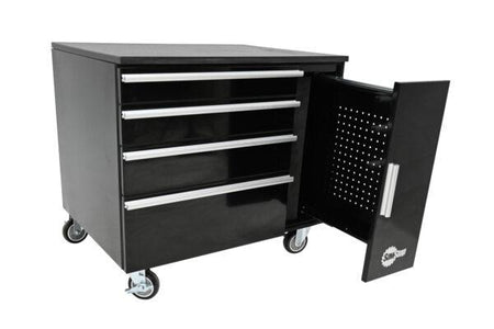 - 1 vertical pegboard and 4 horizontal fully-extendable drawers offer storage for a variety of tools and accessories.