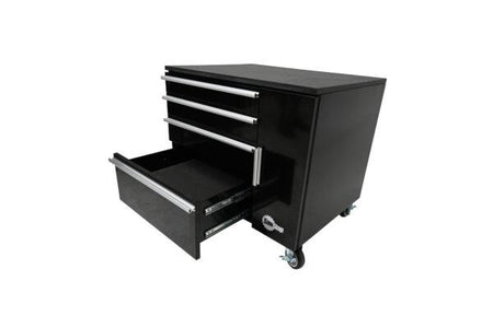 - Heavy-duty welded steel construction. 4 locking, swivel casters for easy mobility. Smooth, slow-close drawer slides.