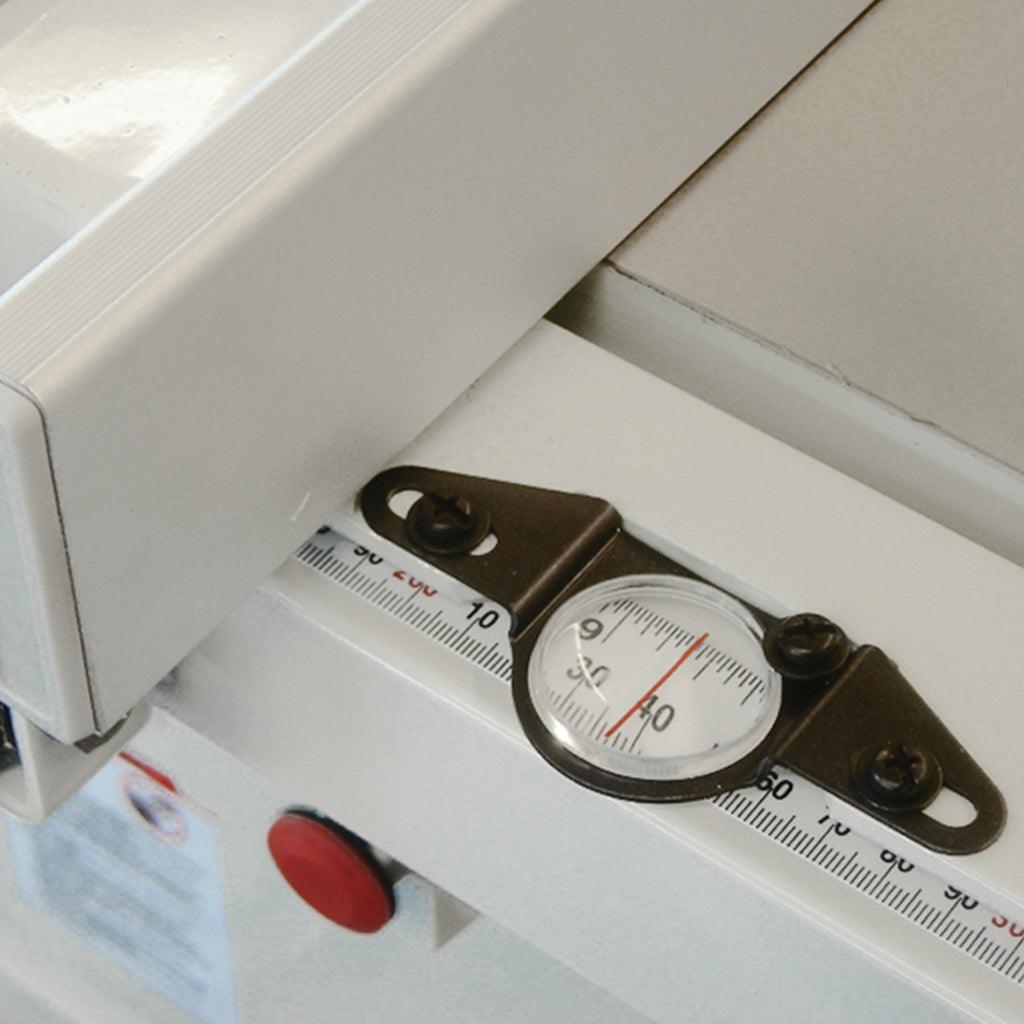 - Dual Inch/Metric scale guide rail on rip fence with magnifying glass for easy visibility